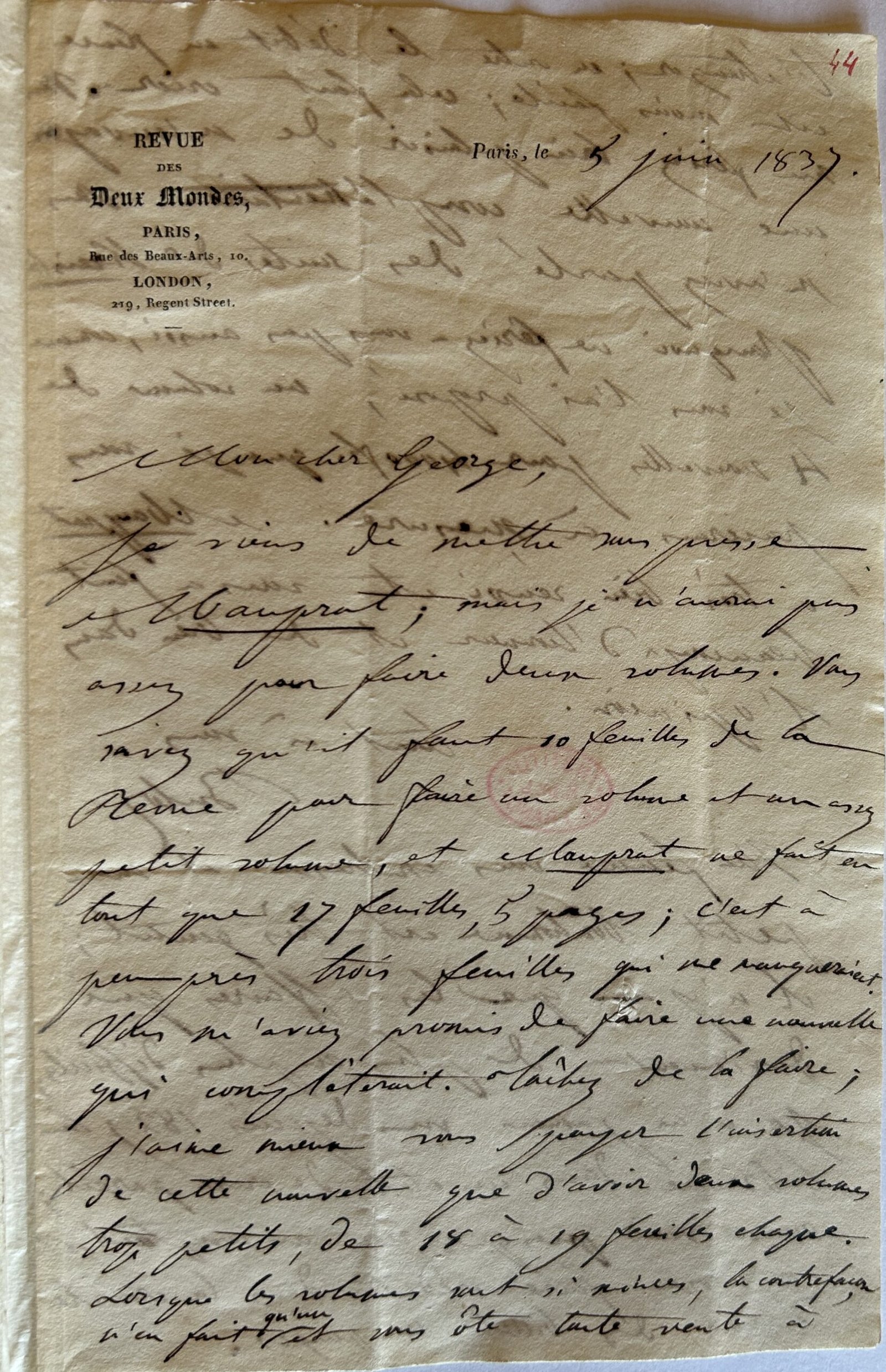 Je viens de mettre sous presse Mauprat ; mais je n’aurai pas assez pour faire deux volumes. Vous savez qu’il faut 10 feuilles de la Revue pour faire un volume et un assez petit volume, et Mauprat ne fait en tout que 17 feuilles, 5 pages ; c’est à peu près trois feuilles qui me manqueraient. Vous m’aviez promis de faire une nouvelle qui complèterait. Tâchez de la faire ; j’aime mieux vous payer l’insertion de cette nouvelle que d’avoir deux volumes trop petits, de 18 à 19 feuilles chaque. Lorsque les volumes sont si minces, la contrefaçon n’en fait qu’un et vous ôte toute vente à l’étranger ; en outre le débit en France est moins facile ; cela fait crier. Vous me feriez bien plaisir de me renvoyer une nouvelle complémentaire. Vous m’aviez parlé des suites de Kreisler. Pourquoi ne feriez-vous pas aussi, comme je vous l’ai proposé, un volume de 4 nouvelles pour 4000 fr. que je vous paierais à mesure. Mauprat a très bien réussi et vous a fait beaucoup d’honneur et de bien dans l’opinion.