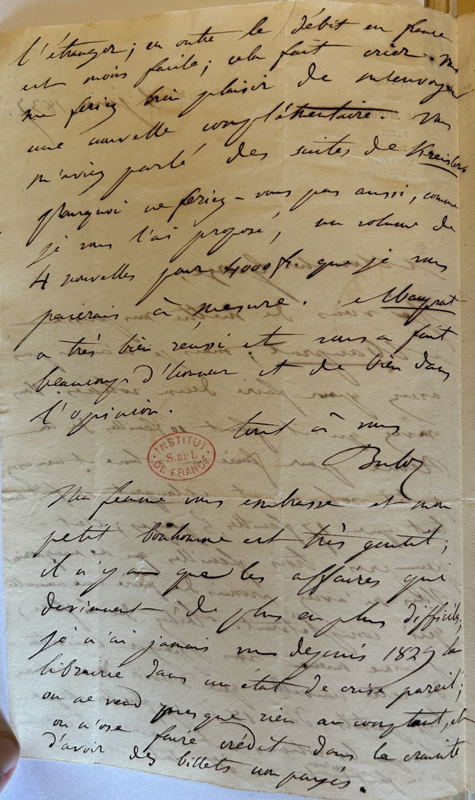 Ma femme vous embrasse et mon petit bonhomme est très gentil ; il n’y a que les affaires qui deviennent de plus en plus difficiles ; je n’ai jamais vu depuis 1829 la librairie dans un état de crise pareil ; on ne vend presque rien au comptant, et on n’ose faire crédit dans la crainte d’avoir des billets non payés.
