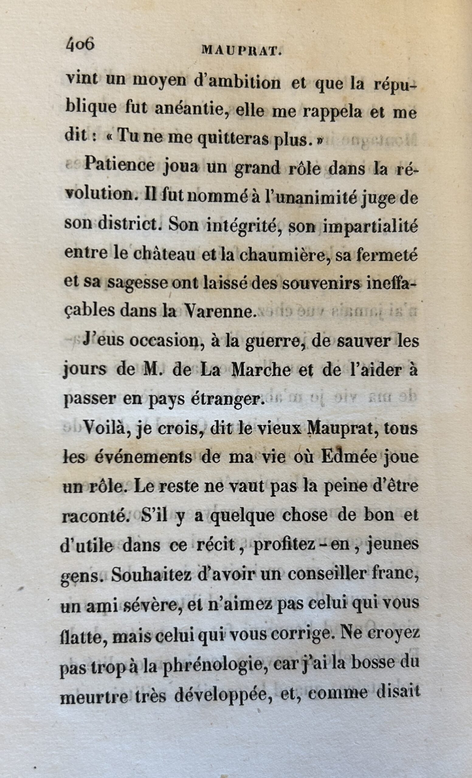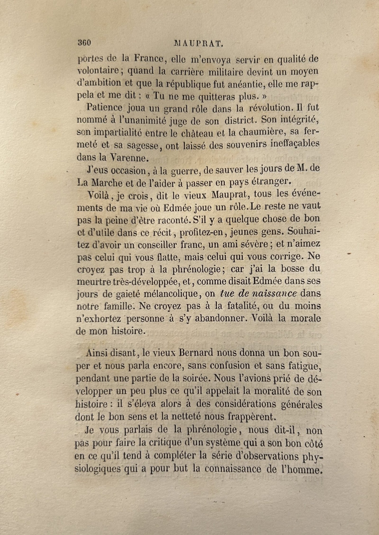 Voilà, je crois, dit le vieux Mauprat, tous les événements de ma vie où Edmée joue un rôle. Le reste ne vaut pas la peine d’être raconté. S’il y a quelque chose de bon et d’utile dans ce récit, profitez-en, jeunes gens. Souhaitez d’avoir un conseiller franc, un ami sévère ; et aimez non pas celui qui vous flatte, mais celui qui vous corrige. Ne croyez pas trop à la phrénologie ; car j’ai la bosse du meurtre très développée, et, comme disait Edmée dans ses jours de gaieté mélancolique, on tue de naissance dans notre famille. Ne croyez pas à la fatalité, ou du moins n’exhortez personne à s’y abandonner. Voilà la morale de mon histoire.