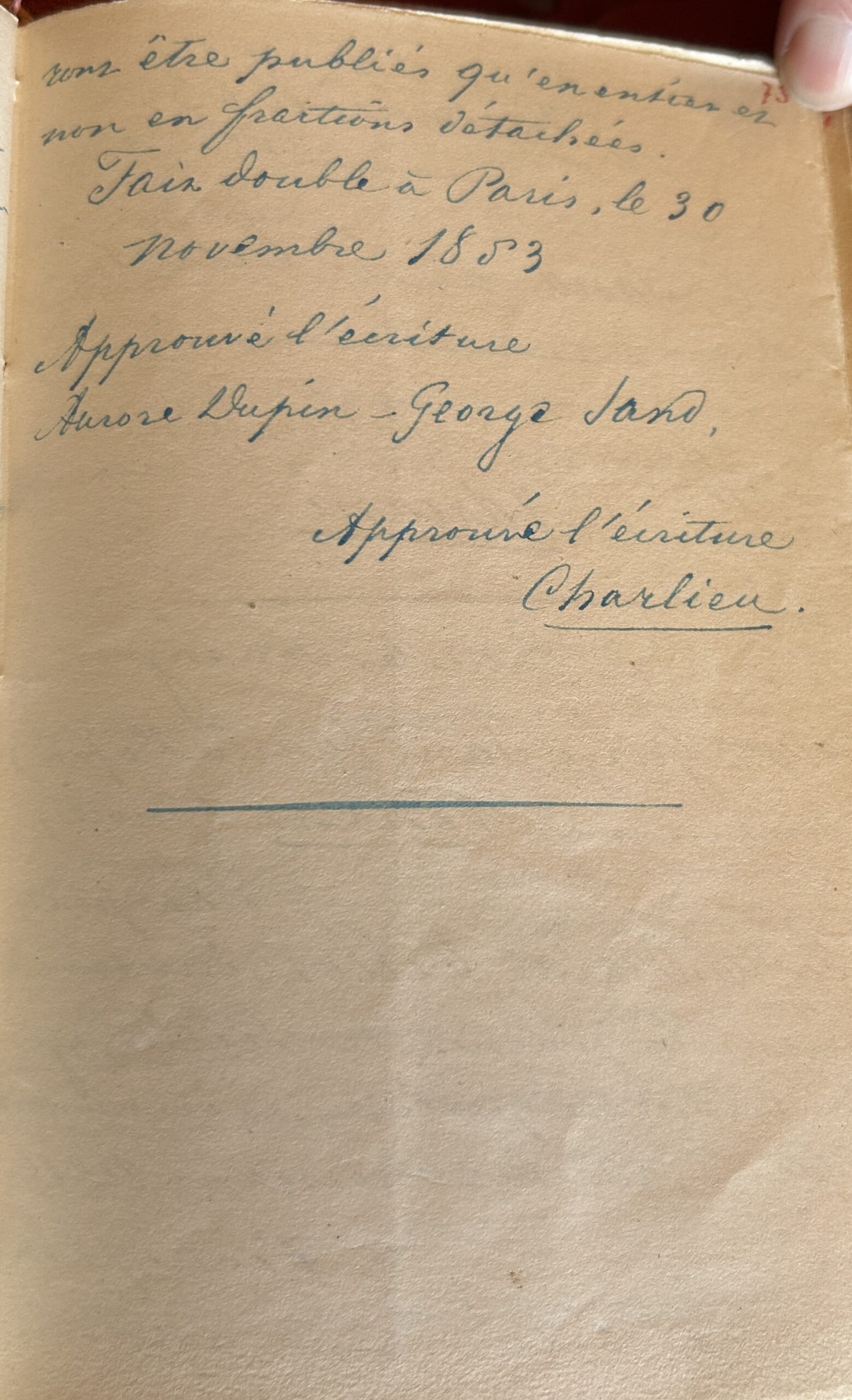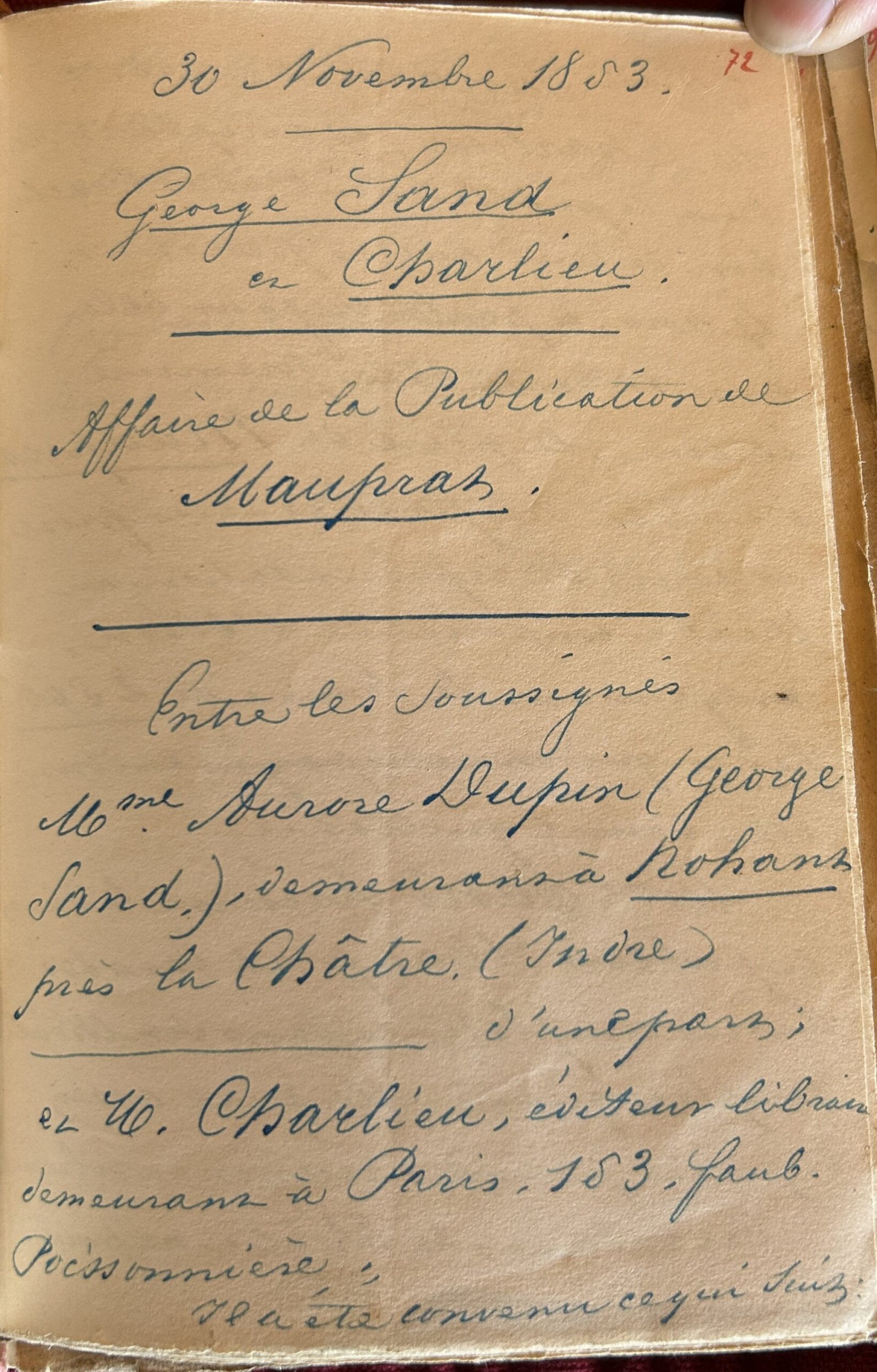Un traité est conclu entre George Sand et l’éditeur-libraire Charlieu en vue de la publication de la pièce Mauprat. Ce contrat prévoit l’impression de l’œuvre dramatique, qui paraît effectivement en 1854 dans la collection de La Librairie théâtrale.