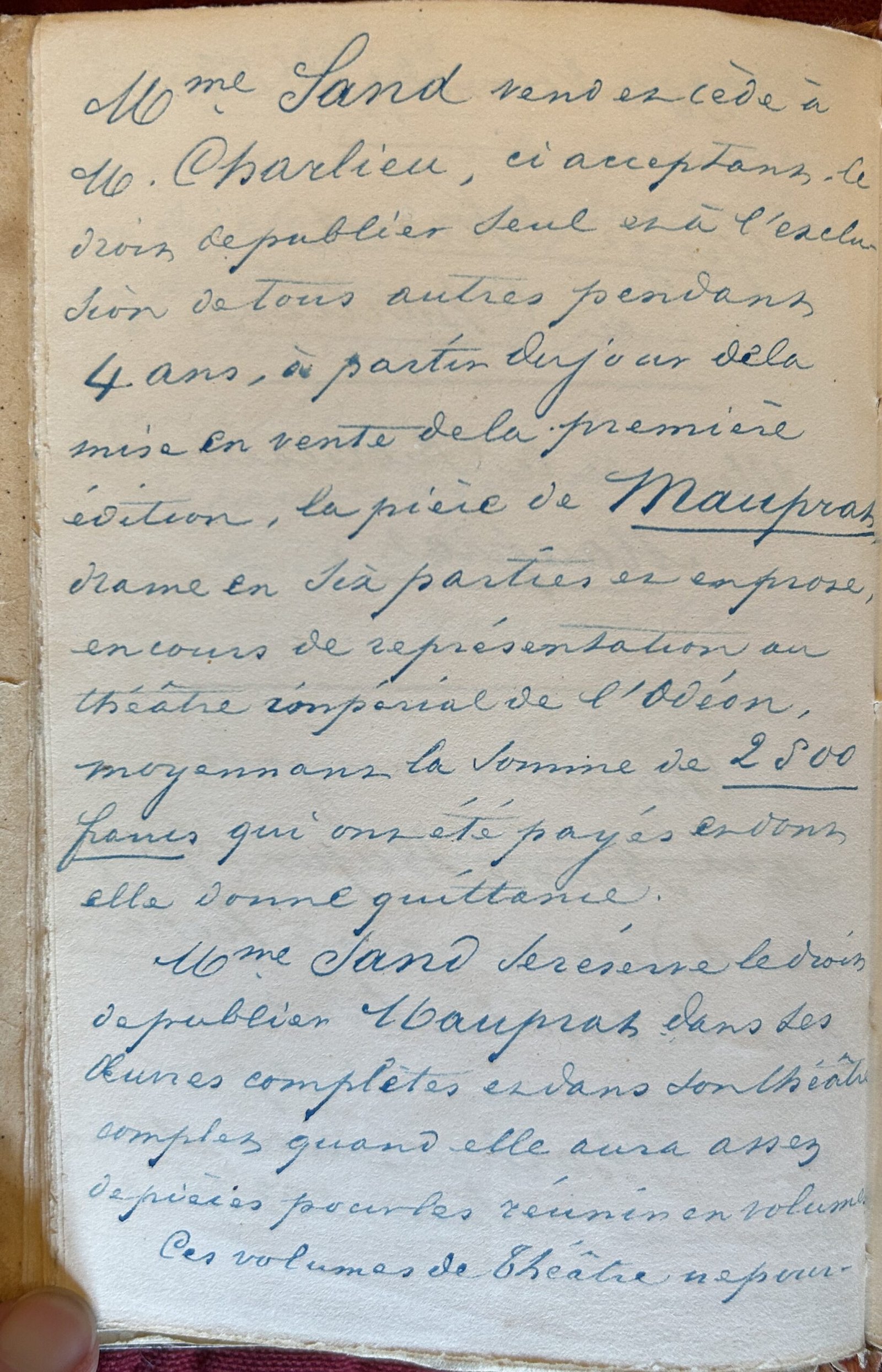 Mme Sand vend et cède à M. Charlieu, ci acceptant, le droit de publier seul et à l’exclusion de tous autres pendant 4 ans, à partir du jour de la mise en vente de la première édition, la pièce de Mauprat, drame en six parties et en prose en cours de représentation au théâtre impérial de l’Odéon, moyennant la somme de 2500 francs qui ont été payés et dont elle donne quittance.