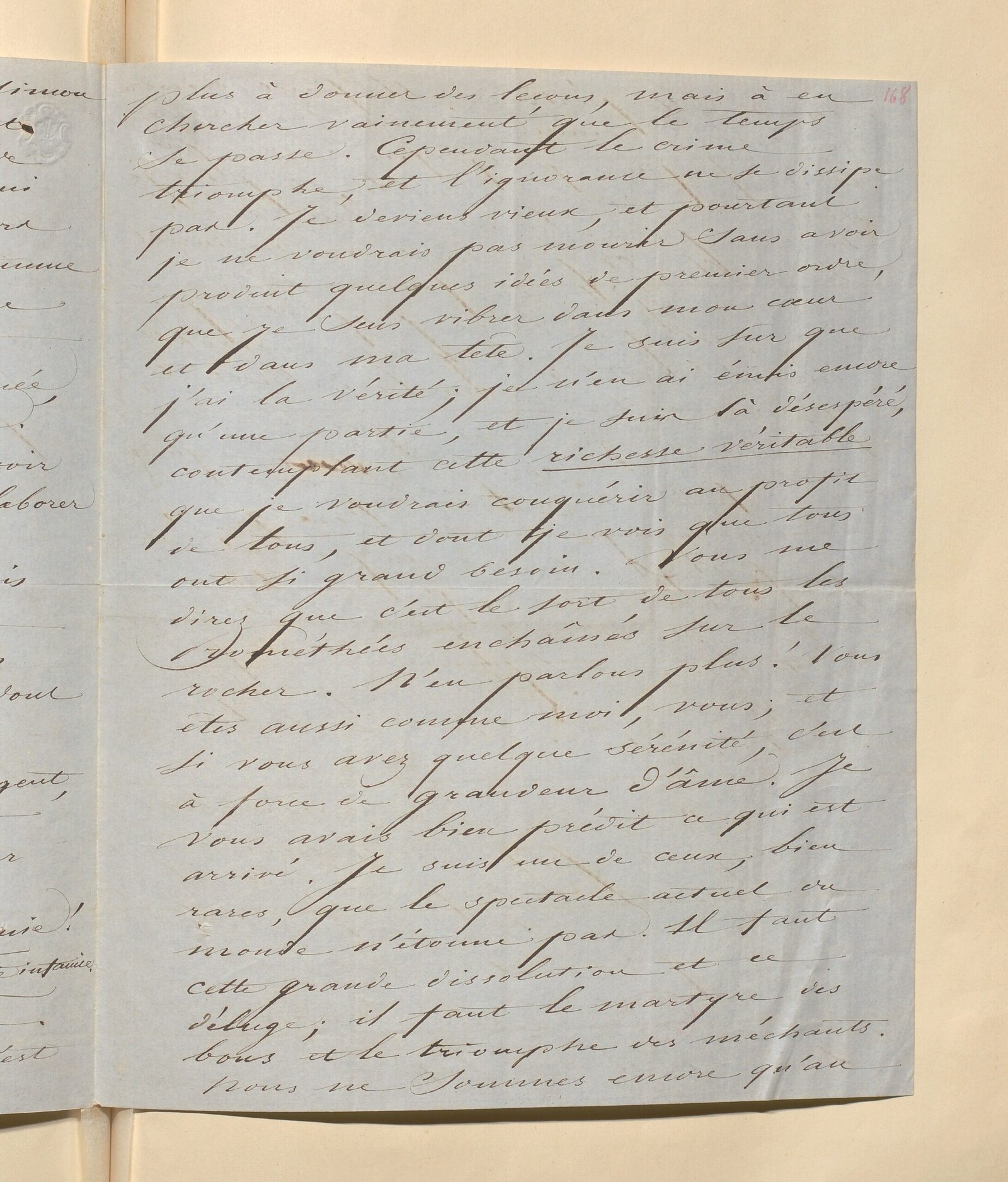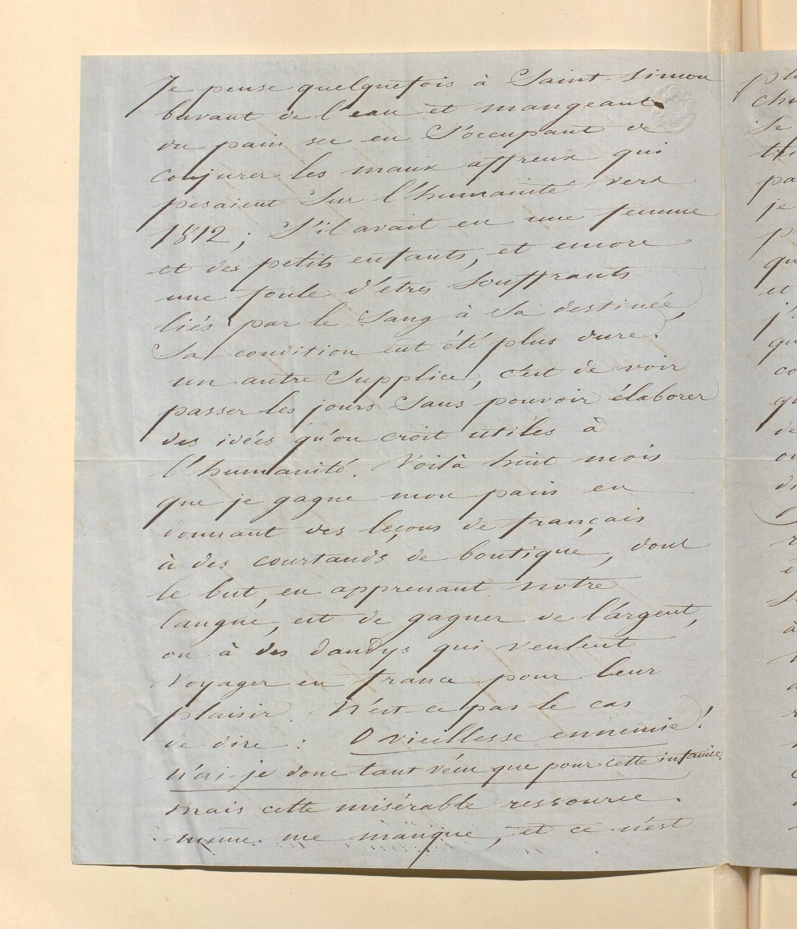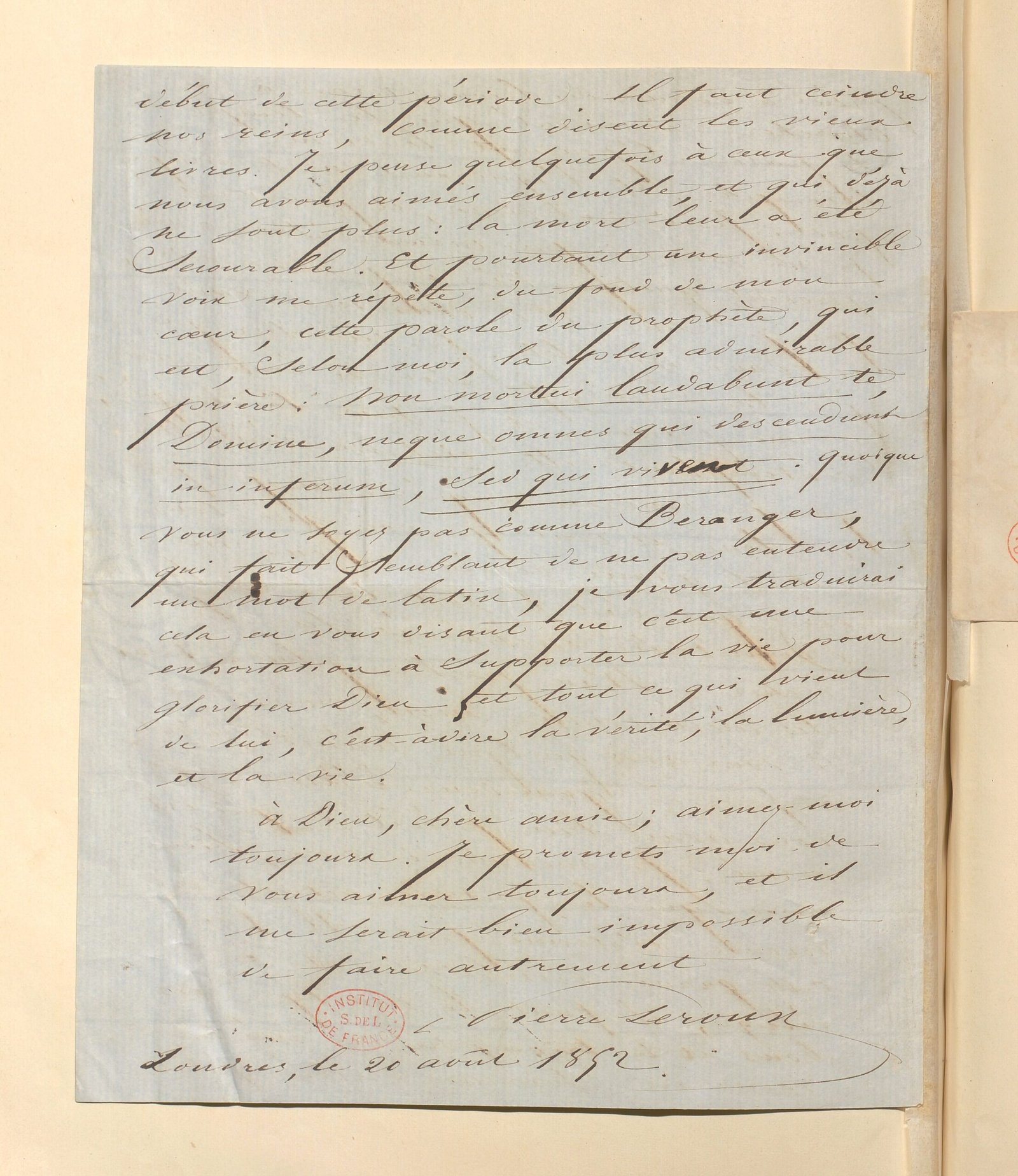 Chère amie, la personne qui vous remettra ce mot n’a pas pour vous de l’admiration, mais quelque chose de plus senti, qu’on pourrait appeler de la dévotion. Louis Blanc, qui lui donne aussi une lettre d’introduction près de vous, pourra vous dire la même chose. Elle va à Nohant en pèlerinage : elle ne peut manquer d’être reçue amicalement, même par une divinité qui n’aime ni les louanges ni l’idolâtrie. Vous aurez par elle des nouvelles de quelques-uns de vos amis. De moi, que vous dira-t-elle ? Je suis triste au-delà du possible ; ce qui ne veut pas dire que je n’oppose pas du courage à tous les coups qui me frappent. J’ai ma femme constamment malade, un de mes enfants tout près du tombeau, et je suis dans l’esclavage le plus dur que puisse engendrer la misère. Je pense quelquefois à Saint-Simon buvant de l’eau et mangeant du pain sec en s’occupant de conjurer les maux affreux qui pesaient sur l’humanité vers 1812 ; s’il avait eu une femme et des petits enfants, et encore une foule d’êtres souffrants liés par le sang à sa destinée, sa condition eût été plus dure. Un autre supplice, c’est de voir passer les jours sans pouvoir élaborer des idées qu’on croit utiles à l’humanité. Voilà huit mois que je gagne mon pain en donnant des leçons de français à des courtauds de boutique, dont le but, en apprenant notre langue, est de gagner de l’argent, ou à des dandys qui veulent voyager en France pour leur plaisir. N’est-ce pas le cas de dire : Ô vieillesse ennemie ! N’ai-je donc tant vécu que pour cette infamie. Mais cette misérable ressource même me manque, et ce n’est plus à donner des leçons, mais à en chercher vainement que le temps se passe. Cependant le crime triomphe, et l’ignorance ne se dissipe pas. Je deviens vieux, et pourtant je ne voudrais pas mourir sans avoir produit quelques idées de premier ordre, que je sens vibrer dans mon cœur et dans ma tête. Je suis sûr que j’ai la vérité ; je n’en ai émis encore qu’une partie, et je suis là désespéré, contemplant cette richesse véritable que je voudrais conquérir au profit de tous, et dont je vois que tous ont si grand besoin. Vous me direz que c’est le sort de tous les Prométhées enchaînés sur le rocher. N’en parlons plus ! Vous êtes aussi comme moi, vous ; et si vous avez quelque sérénité, c’est à force de grandeur d’âme. Je vous avais bien prédit ce qui est arrivé. Je suis un de ceux, bien rares, que le spectacle actuel du monde n’étonne pas. Il faut cette grande dissolution et ce déluge ; il faut le martyre des bons et le triomphe des méchants. Nous ne sommes encore qu’au début de cette période. Il faut ceindre nos reins, comme disent les vieux livres. Je pense quelquefois à ceux que nous avons aimés ensemble, et qui déjà ne sont plus : la mort leur a été secourable. Et pourtant une invincible voix me répète, du fond de mon cœur, cette parole du prophète, qui est, selon moi, la plus admirable prière : Non mortui laudabunt te, Domine, neque omnes qui descendunt in infernum, sed qui vivent. Quoique vous ne soyez pas comme Beranger qui fait semblant de ne pas entendre un mot de latin, je vous traduirai cela en vous disant que c’est une exhortation à supporter la vie pour glorifier Dieu et tout ce qui vient de lui, c’est-à-dire la vérité, la lumière et la vie.