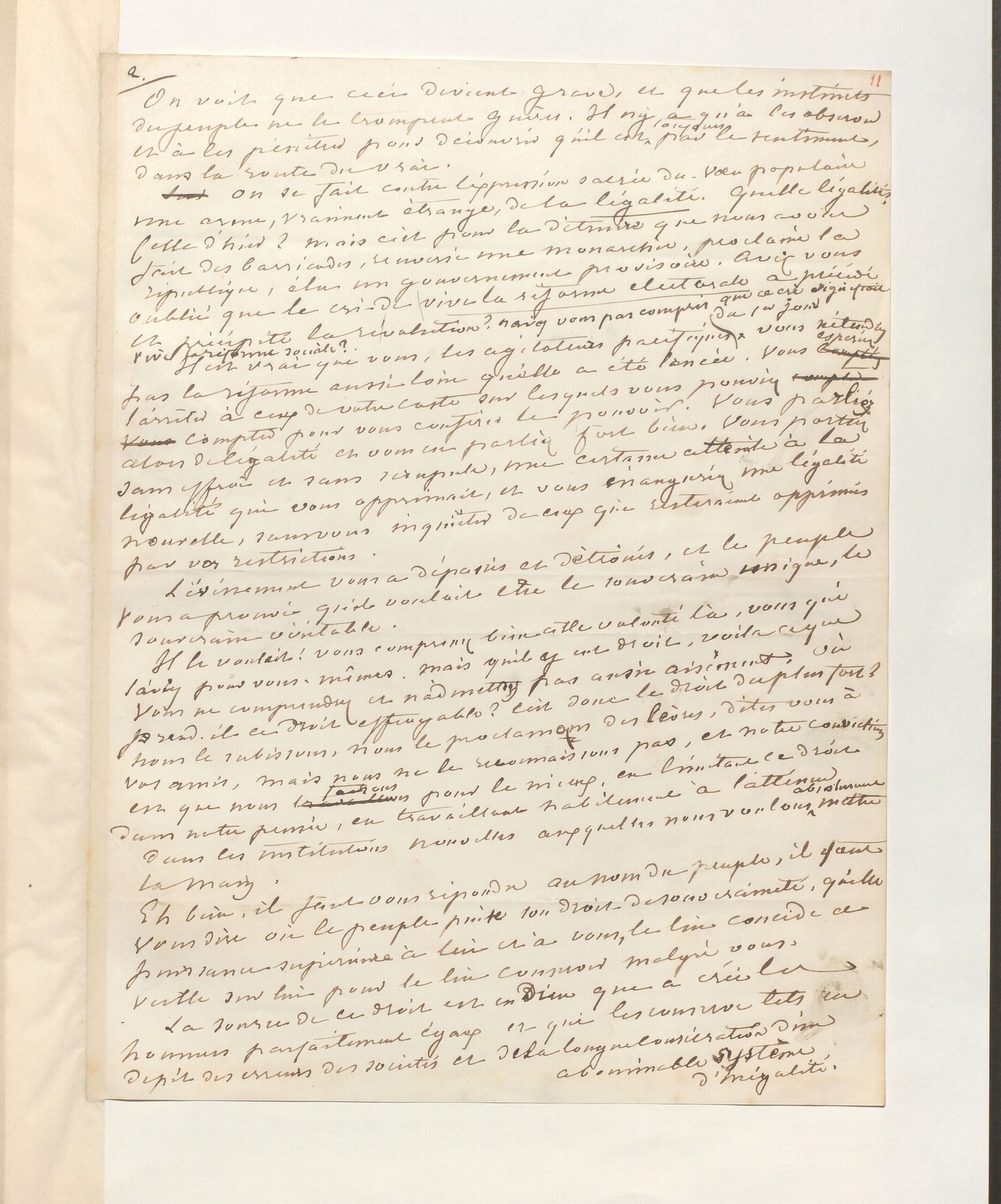 On se fait contre l’expression sacrée du vœu populaire une arme, vraiment étrange, de la légalité. Quelle légalité ? Celle d’hier ? Mais c’est pour la détruire que nous avons fait des barricades, renversé une monarchie, proclamé la république, élu un gouvernement provisoire. Avez-vous oublié que le cri de vive la réforme électorale a précédé et précipité la révolution ? N’avez-vous pas compris que ce cri signifiait vive la réforme sociale ?