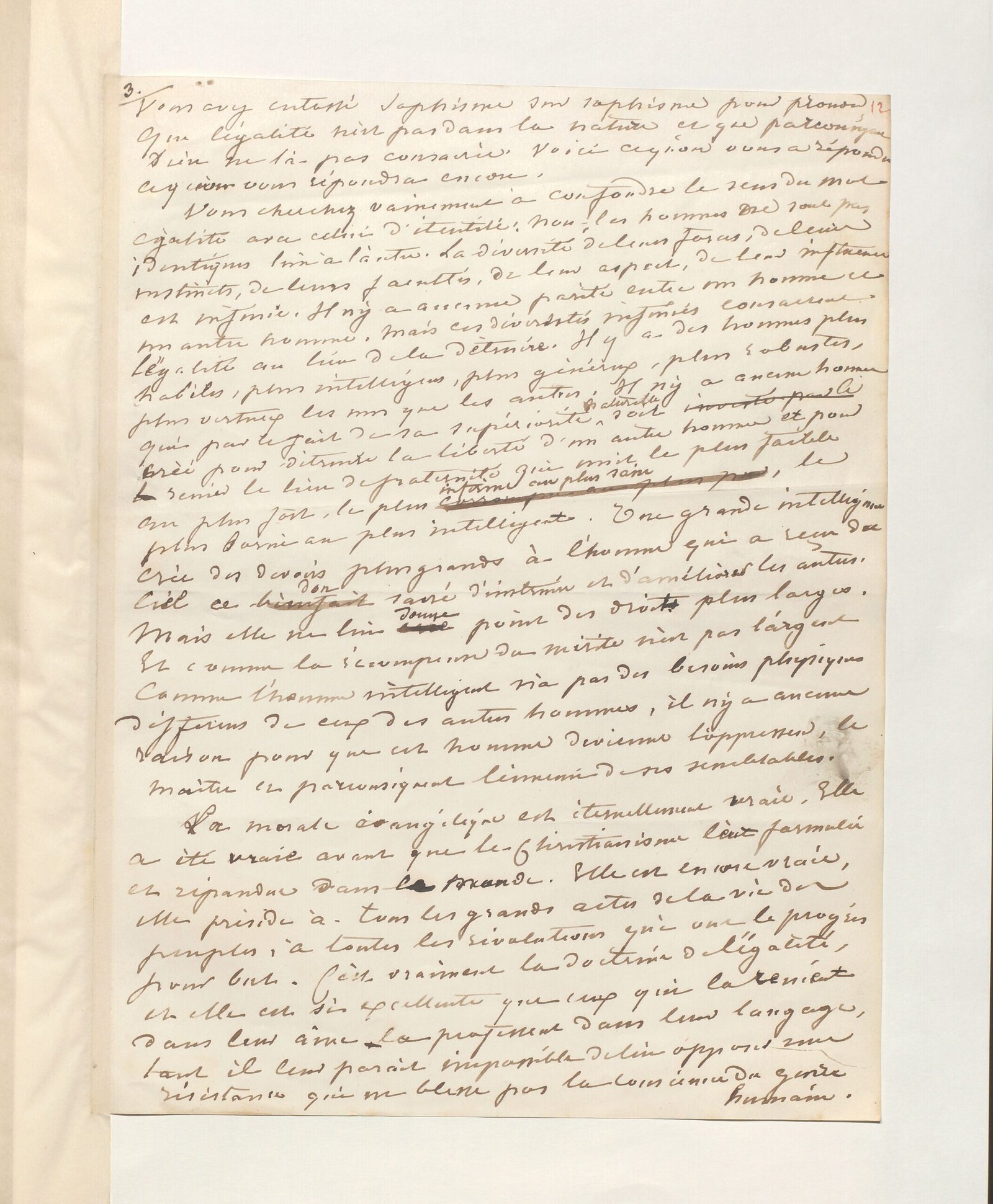 Vous cherchez vainement à confondre le sens du mot égalité avec celui d’identité : non, les hommes ne sont pas identiques l’un à l’autre. La diversité de leurs forces, de leurs instincts, de leurs facultés, de leur aspect, de leur influence est infinie. Il n’y a aucune parité entre un homme et un autre homme. Mais ces diversités infinies consacrent l’égalité au lieu de la détruire. Il y a des hommes plus habiles, plus intelligents, plus généreux, plus robustes, plus vertueux les uns que les autres ; il n’y a aucun homme qui par le fait de sa supériorité naturelle soit créé pour détruire la liberté d’un autre homme et pour renier le lien de fraternité qui unit le plus faible au plus fort, le plus infirme au plus sain, le plus borné au plus intelligent. Une grande intelligence crée des devoirs plus grands à l’homme qui a reçu du ciel ce don sacré d’instruire et d’améliorer les autres. Mais elle ne lui donne point des droits plus larges. Et comme la récompense du mérite n’est pas l’argent, comme l’homme intelligent n’a pas des besoins physiques différents de ceux des autres hommes, il n’y a aucune raison pour que cet homme devienne l’oppresseur, le maître et par conséquent l’ennemi de ses semblables.