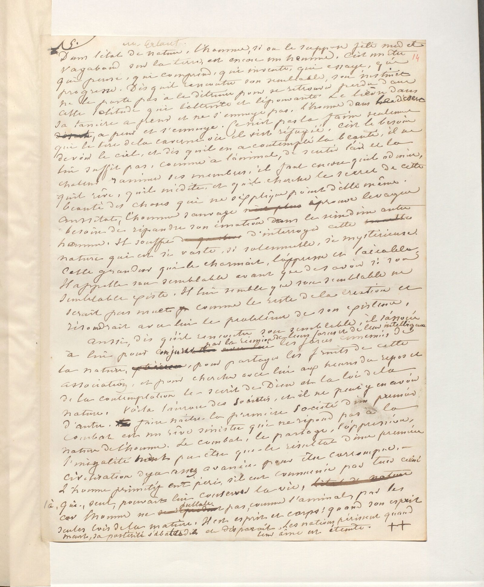 Dans l’état de nature, l’homme, si on le suppose jeté nu et vagabond sur la terre, est encore un homme. C’est un être qui pense, qui comprend, qui invente, qui essaye, qui progresse. Dès qu’il rencontre son semblable, son instinct ne le porte pas à le détruire pour se retrouver perdu dans cette solitude qui l’attriste et l’épouvante. Le lièvre dans sa tanière a peur et ne s’ennuie pas, l’homme dans le désert, a peur et s’ennuie. Ce n’est pas la faim seulement qui le tire de la caverne où il s’est réfugié, c’est le besoin de voir le ciel, et dès qu’il en a contemplé la beauté, il ne lui suffit pas, comme à l’animal, de sentir l’air et la chaleur ranimer ses membres, il faut encore qu’il admire, qu’il rêve, qu’il médite, et qu’il cherche le secret de cette beauté des choses qui ne s’explique point d’elle-même. Aussitôt, l’homme sauvage éprouve le vague besoin de répandre son émotion dans le sein d’un autre homme. Il souffre d’interroger cette nature qui est si vaste, si solennelle, si mystérieuse. Cette grandeur qui le charmait, l’oppresse et l’accable. Il appelle son semblable avant que de savoir si son semblable existe. Il lui semble que son semblable ne serait pas muet comme le reste de la création et résoudrait avec lui le problème de son existence.