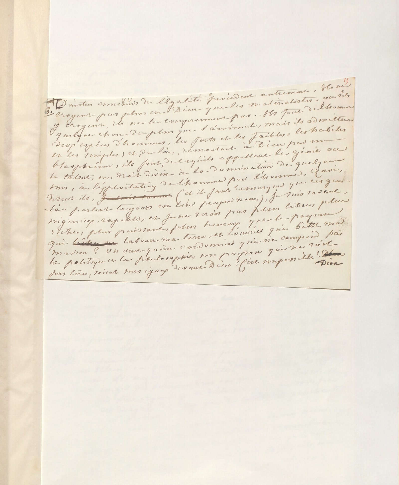 D’autres ennemis de l’égalité procèdent autrement. Ils ne croient pas plus en Dieu que les matérialistes, ou s’ils y croient, ils ne le comprennent pas. Ils font de l’homme quelque chose de plus que l’animal, mais ils admettent deux espèces d’hommes, les forts et les faibles, les habiles et les simples ; et, de là, remontant à Dieu par un blasphème, ils font, de ce qu’ils appellent le génie ou le talent, un droit divin à la nomination de quelques-uns, à l’exploitation de l’homme par l’homme. Quoi, disent-ils (et il faut remarquer que ces gens-là parlent toujours en leur propre nom), je suis savant, ingénieux, capable, et je ne serais pas plus libre, plus riche, plus puissant, plus heureux que le paysan qui laboure ma terre, et l’ouvrier qui bâtit ma maison ? On veut qu’un cordonnier qui ne comprend pas la politique et la philosophie, un paysan qui ne sait pas lire, soient mes égaux devant Dieu ? C’est impossible ! Dieu fait des parts inégales puisqu’il m’a créé grand homme, et la société qui m’a donné la richesse et le privilège n’a fait que se conformer aux décrets de la providence.