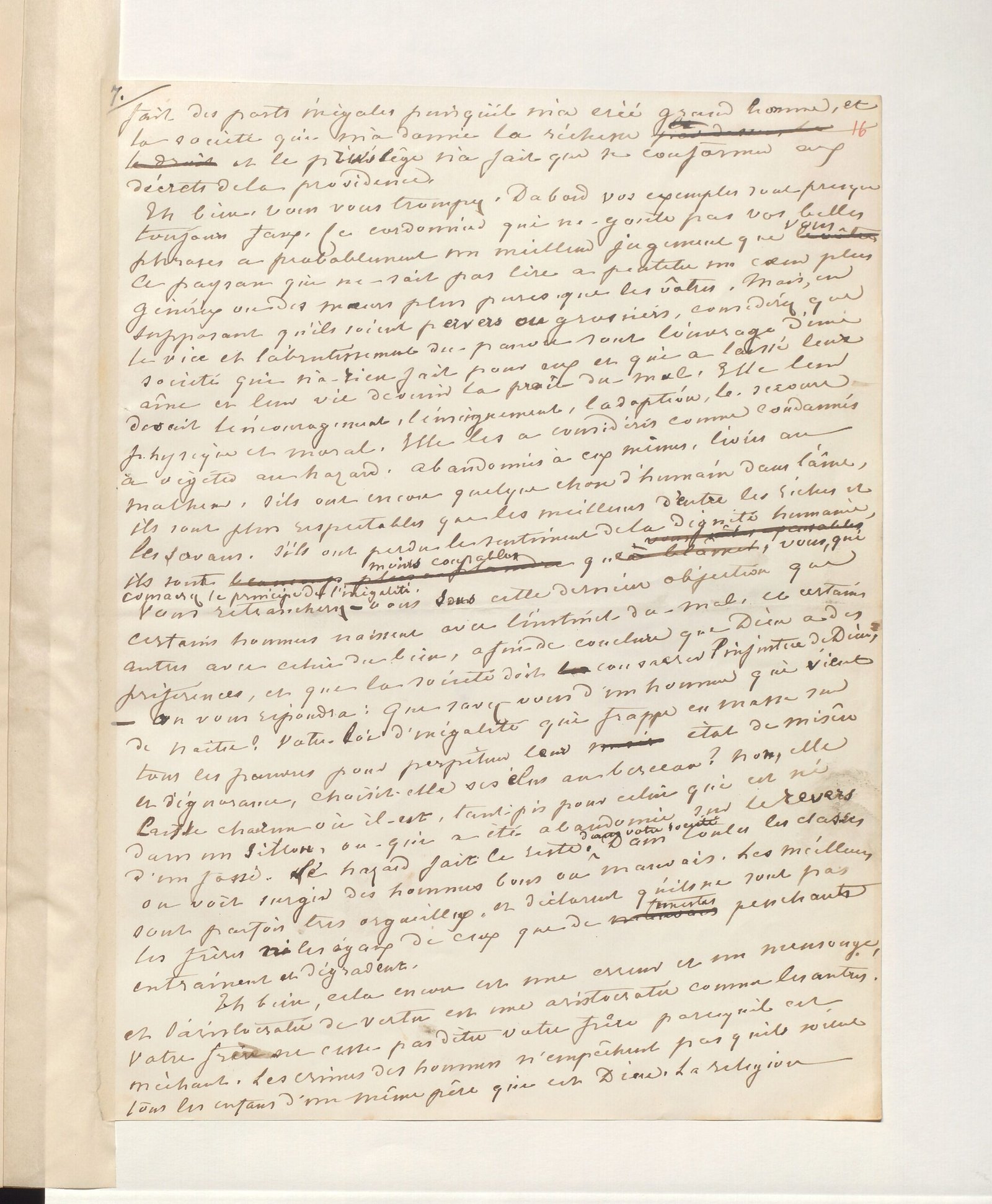 Eh bien, cela encore est une erreur et un mensonge, et l’aristocratie de vertu est une aristocratie comme les autres. Votre frère ne cesse pas d’être votre frère parce qu’il est méchant. Les crimes des hommes n’empêchent pas qu’ils soient tous les enfants d’un même père qui est Dieu. La religion catholique donne le ciel aux uns, l’enfer aux autres. Dieu qui est au-dessus de toutes les religions ne peut détruire son œuvre, Dieu lui-même ne pourrait pas empêcher que les damnés fussent encore les frères des bienheureux. Non, il n’y a pas d’inégalité parmi les hommes, tous ont les mêmes droits. S’il y a une différence dans les devoirs c’est que les plus intelligents et les meilleurs ont des devoirs proportionnés à l’étendue de leur intelligence et à l’activité de leur zèle. Dieu leur dit : Je vous donne les moyens de faire le bien, faites donc à vous seul plus de bien que plusieurs ensemble.