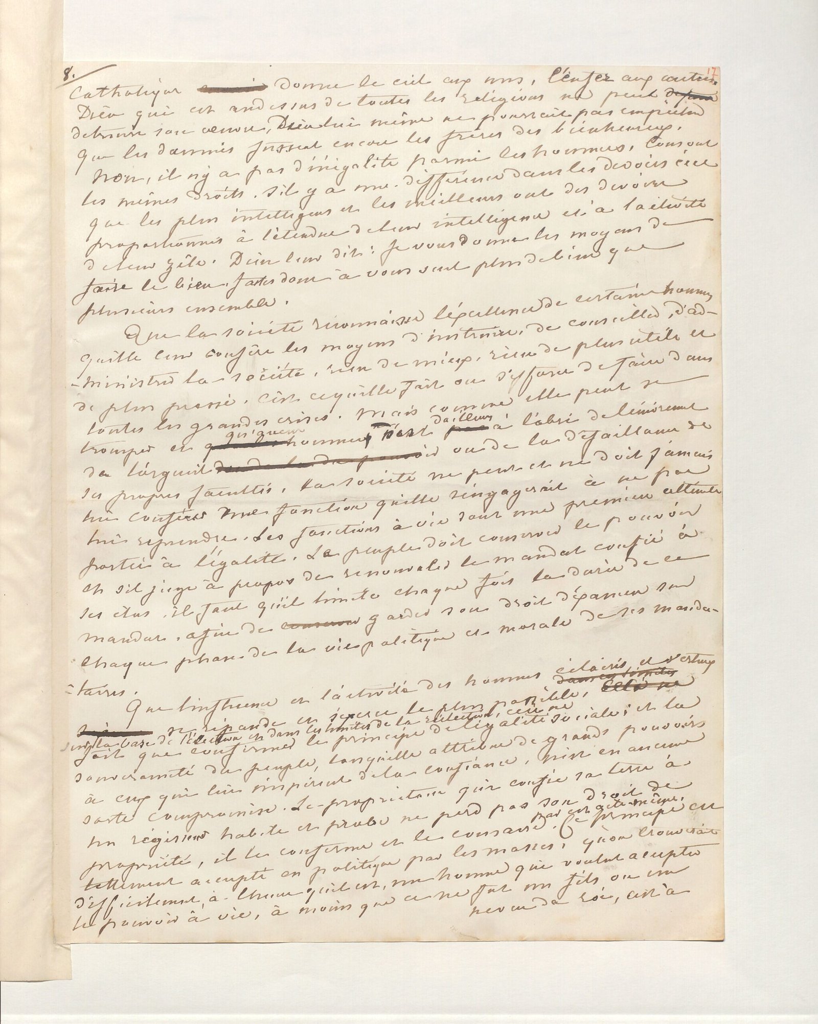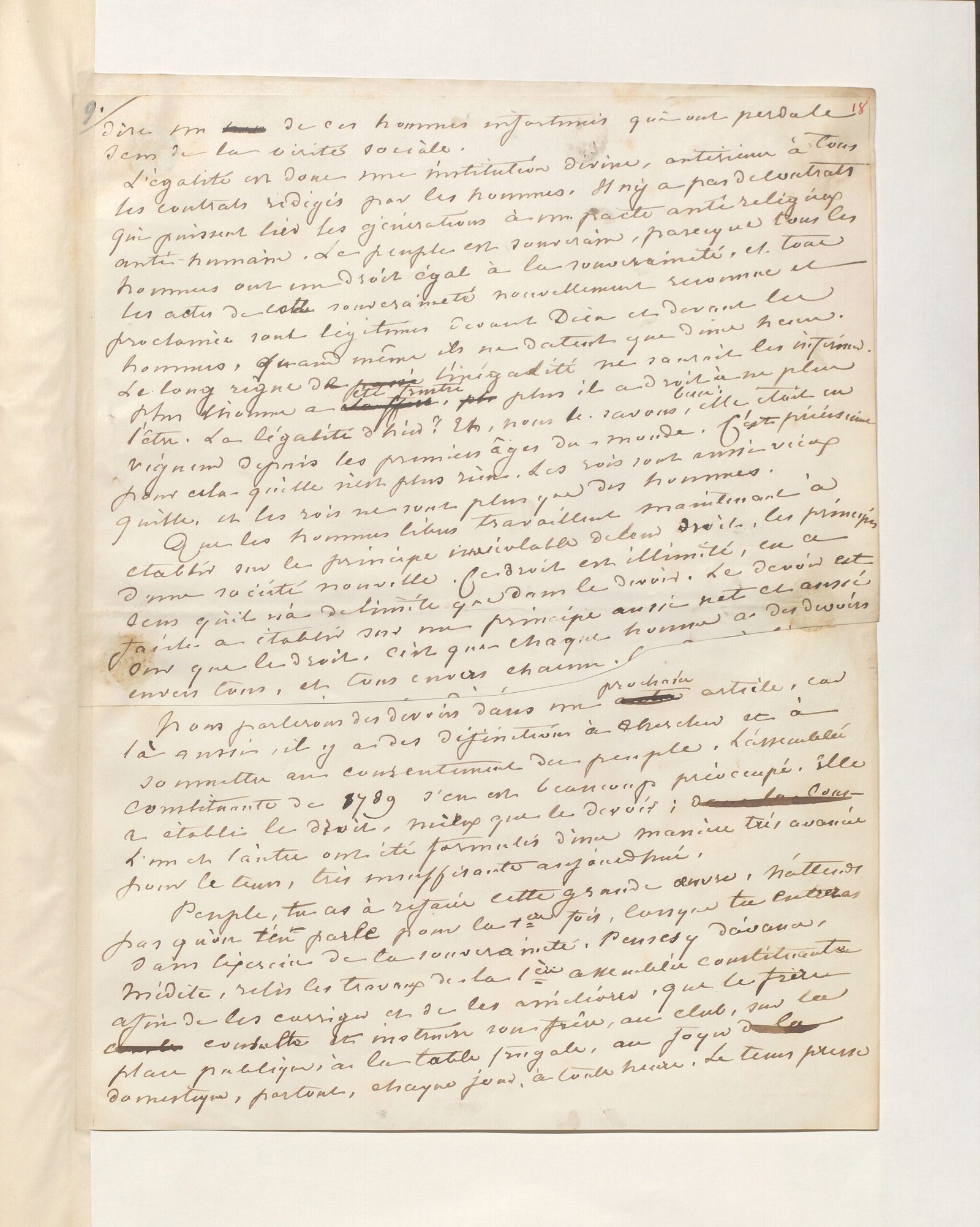 Que la société reconnaisse l’excellence de certains hommes, qu’elle leur confère les moyens d’instruire, de conseiller, d’administrer la société, rien de mieux, rien de plus utile et de plus pressé. C’est ce qu’elle fait ou s’efforce de faire dans toutes les grandes crises. Mais comme elle peut se tromper et qu’aucun homme n’est d’ailleurs à l’abri de l’enivrement de l’orgueil ou de la défaillance de ses propres facultés, la société ne peut et ne doit jamais lui conférer une fonction qu’elle s’engagerait à ne pas lui reprendre. Les fonctions à vie sont une première atteinte portée à l’égalité. Le peuple doit conserver le pouvoir et s’il juge à propos de renouveler le mandat confié à ses élus, il faut qu’il limite chaque fois la durée de ce mandat, afin de garder son droit d’examen sur chaque phase de la vie politique et morale de ses mandataires.