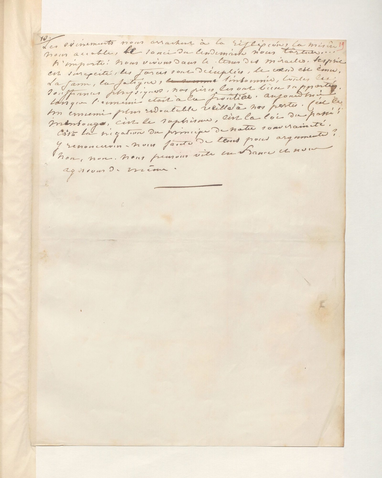Que les hommes libres travaillent maintenant à établir sur le principe inviolable de leur droit, les principes d’une société nouvelle. Ce droit est illimité, en ce sens qu’il n’a de limite que dans le devoir. Le devoir est facile à établir sur un principe aussi net et aussi sûr que le droit, c’est que chaque homme a des devoirs envers tous, et tous envers chacun.
